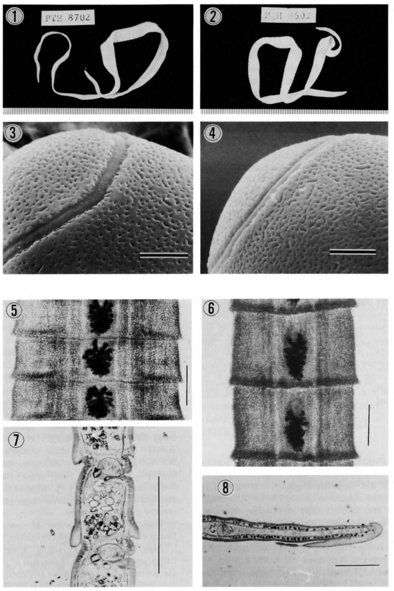 Fig. 1. Strobila originated from plerocercoid in Japanese surf smelt (PTI 18702). Scale: 1mm. Fig. 2. Strobila originated from plerocercoid in olive rainbow smelt (PQH8602). Scale: 1 mm. Fig. 3. Eggshell surface through SEM (Japanese surf smelt origin). Bar: 5 um. Fig. 4. Eggshell surface through SEM (olive rainbow smelt origin). Bar: 5 um. Fig. 5. Mature segments (PTH8603). Bar: 1mm. Fig. 6. Gravid segments (PTH8603). Bar: 1mm. Fig. 7. Longitudinal section of mature segment (PTH8603). Bar: 1mm. Fig. 8. Transverse section of mature segment (PTH8603). Bar: 2mm.
