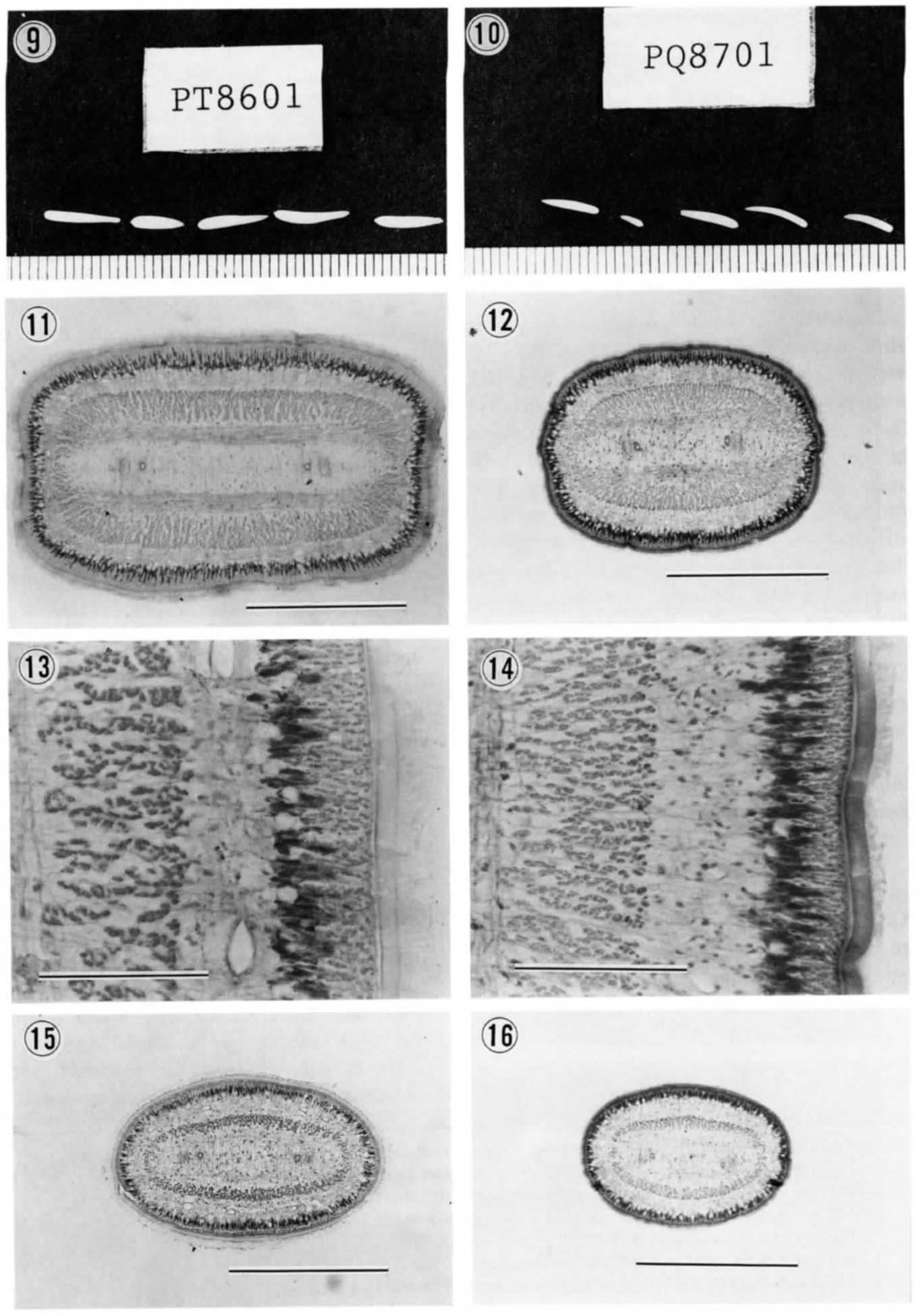 Fig. 9. Plerocercoids killed in folmol-saline from Japanese surf smelt. Scale: 1mm. Fig. 10. Plerocercoids killed in formol-saline from olive rainbow smelt. Scale: 1mm. Fig. 11. Transverse section of plerocercoid at level of midbody from Japanese surf smelt. Bar: 0.5 mm. Fig. 12. Transverse section of plerocercoid at level of midbody from olive rainbow smell. Bar: 0.5 mm. Fig. 13. Higher magnification of part of Fig. 11. Bar: 0.1 mm. Fig. 14. Higher magnification of part of Fig. 12. Bar: 0.1 mm. Fig. 15. Transverse section of plerocercoid at level of posterior body from Japanese surf smell. Bar: 0.5 mm. Fig. 16. Transverse section of plerocercoid at level of posterior from olive rainbow smell. Bar: 0.5 mm.