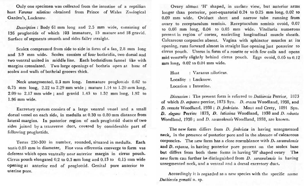 Gupta, S.P. and N. Sinha. 1979. On a new cestode Duthiersia gomatii n. sp. from reptilian host Varanus niloticus from Lucknow. Indian Journal of Parasitology 31: 72-74. (7622) Download PDF |