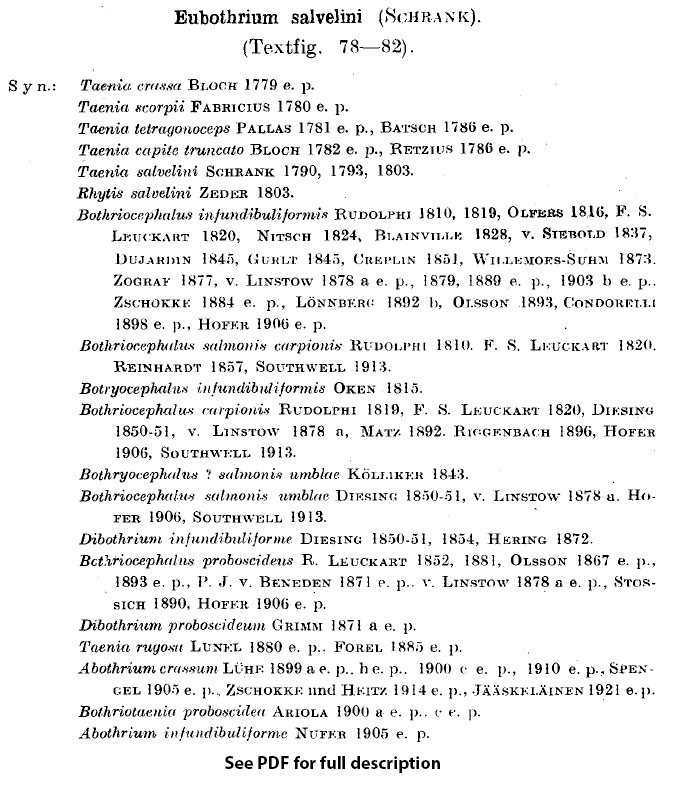 | Synonyms | Taenia salvelini Schrank, 1790; Rhytis salvelini Zeder, 1803 |