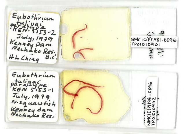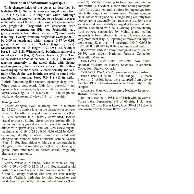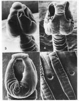 Fig. 4. SEM photomicrograph, lateral view of scolex. X72. Fig. 5. SEM photomicrograph, dorsal view of ... MoreFig. 3. SEM photomicrograph, lateral view of scolex showing apical disk and median groove. X86.