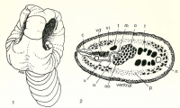Fig. 1. Diagra... MoreAbbreviations : c, cirrus; m, Mehlis gland; n, nerve cord; o, ovary, oo, ootype; p, parenchymal longitudinal muscles; t, testes; u, uterus; v, vagina; vd, vas deferens; vi, vitellaria.