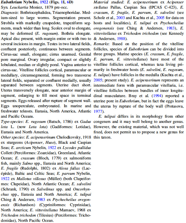 Kuchta, R., T. Scholz, and R. A. Bray. 2008. Revision of the order Bothriocephalidea Kuchta, Scholz, Brabec & Bray, 2008 (Eucestoda) with amended generic diagnoses and keys to families and genera. Systematic Parasitology 71: 81-136.