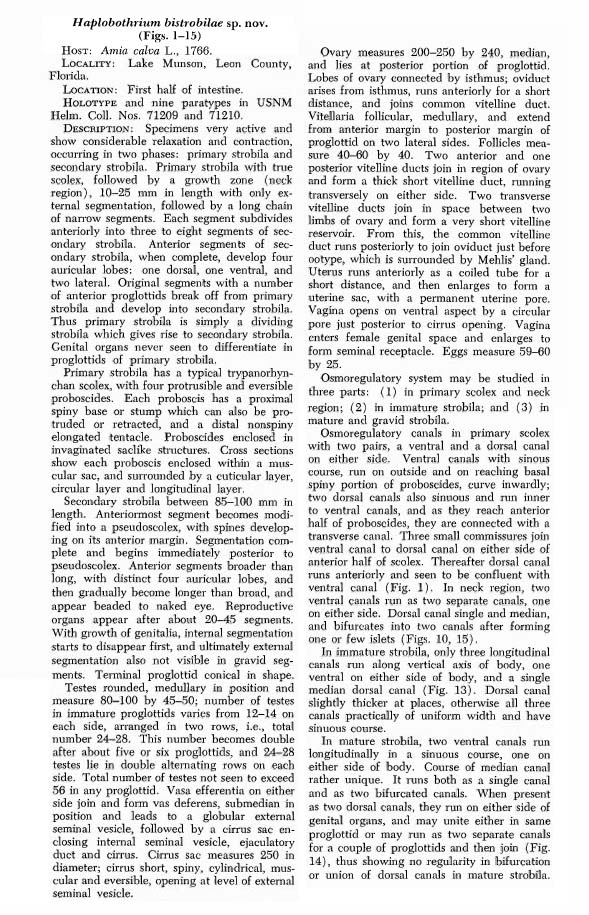 Premvati, G. 1969. Studies on Haplobothrium bistrobilae sp. nov. (Cestoda: Pseudophyllidea) from Amia calva L. Proceedings of the Helminthological Society of Washington 36(1): 55-60. (4732) Download PDF |