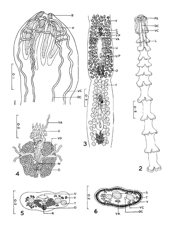 Figures 1-6. Haplobothrium bistrobilae sp. nov. 1. Camera lucida sketch of primary scolex of living specimen to show the proboscides and osmoregulatory system. 2. Pseudoscolex of secondary strobila with immature proglottids. 3. Two mature proglottids: the first showing vitellaria and the other position of testes. 4. Enlarged view of female genitalia. 5. Cross section from the region of ovary of a mature proglottid. 6. Cross section from the region of external seminal vesicle of a mature proglottid. Abbreviations used: B, basal spiny portion of proboscis; C, cirrus sac; DC, dorsal canal; G, male genital pore; L, auricular lobe; M, Mehlis' gland; O, ovary; P, proboscis; PS, pseudoscolex; R, seminal receptacle; S, external seminal vesicle; T, testis; U, uterus; UP, uterine pore; V, vitellaria; VA, vagina; VC, ventral canal; VD, vitelline duct; VP, vaginal pore.