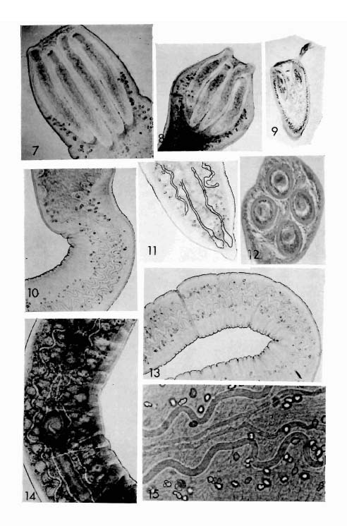 retracted tentacles of the proboscides. 9. Frontal section of primary scolex. 10. Osmoregulatory system in neck region of living specimen. Primary strobila, showing bifurcation of median dorsal canal. 11. Posteriormost proglottid in living specimen showing excretory pores of ventral canals and two excretory vesicles of dorsal canals. (Note: Figure retouched.) 12. Cross section of primary scolex showing proboscides. 13. Osmoregulatory system in living immature proglottids, showing two ventral canals and single median dorsal canal. 14. Osmoregulatory system in living mature proglottids, showing two ventral canals and union and bifurcation of dorsal canal. 15. A portion of dorsal canal of neck region of living primary strobila to show islets before bifurcation into two dorsal canals.
