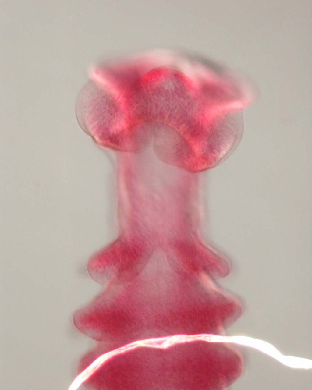 Figures 7-15. Haplobothrium bistrobilae sp. nov. (Photomicrographs). 7. Living primary scolex showing completely retracted proboscides. 8. Living primary scolex showing protruded basal spiny portion and