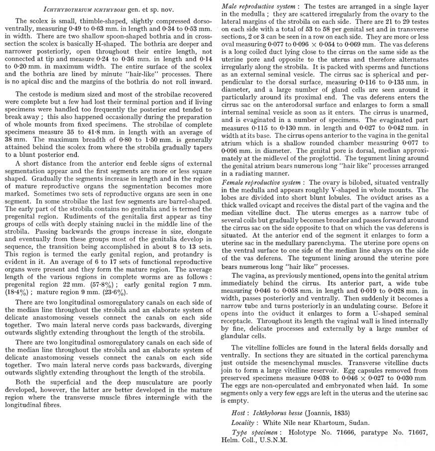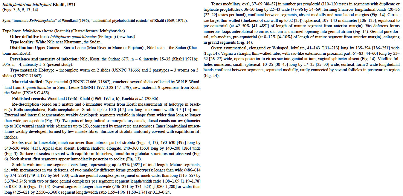Khalil, L. F. 1971. Ichthybothrium ichthybori gen. et sp. nov. (Cestoda: Pseudophyllidea) from the African freshwater fish Ichthyborus besse (Joannis, 1835). Journal of Helminthology 45(4): 371-379. (4785) Download PDF |