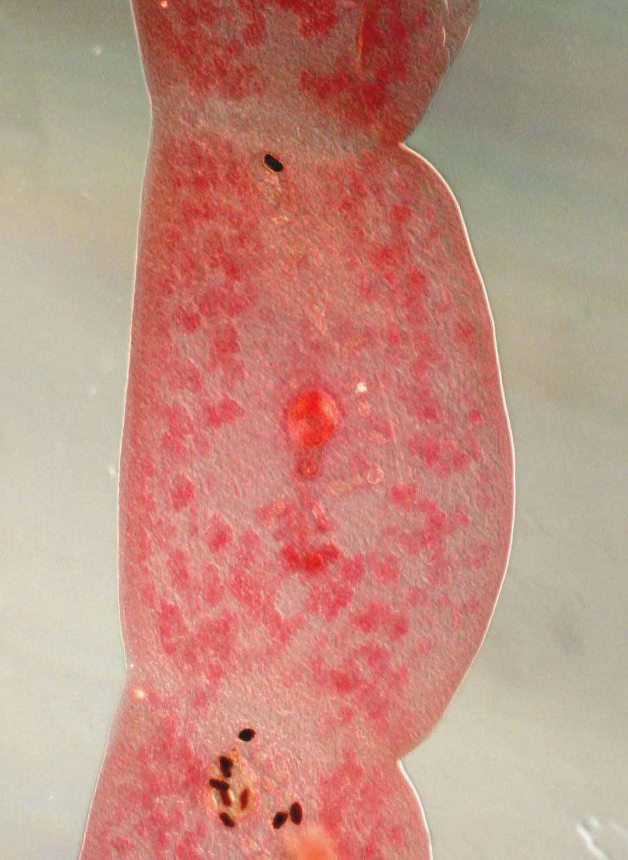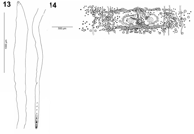 Figures 13, 14. Ichthybothrium ichthybori Khalil, 1971 ex Ichthyborus besse from the Sudan (IPCAS C-455). 13, Complete worm with single genital complex per segment. 14, Mature segment with double genital complexes.
