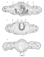 Fig. 6 Cross section of mature proglottid at level of ovary; Fig. 7 Cross section of mature proglottid at level of cirrus-sac; Fig. 8 Cross section of mature proglottid at level of uterine pore.