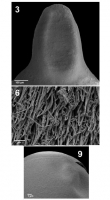 Figures 3, 6, 9, Ichthybothrium ichthybori Khalil, 1971 ex Ichthyborus besse from Sudan (IPCAS C-455). 3, Scolex, dorsoventral view. 6, Surface of apical region of scolex. 9, Detail of operculum of egg.