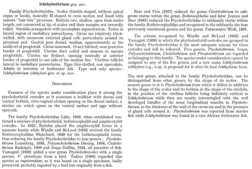 Khalil, L. F. 1971. Ichthybothrium ichthybori gen. et sp. nov. (Cestoda: Pseudophyllidea) from the African freshwater fish Ichthyborus besse (Joannis, 1835). Journal of Helminthology 45(4): 371-379.