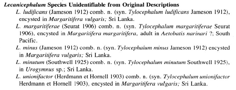 | Scientific Name Notes | This species was described for specimens identified as lecanicephalidean larvae from a pearl oyster. Jameson also described an adult worm from "Aetobatis narinari" from Shipley's material which he considered to be "in all probability the adult of this larva". This species is essentially unrecognizable based on its original description and is therefore considered a species inquirenda. |