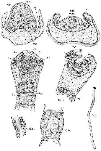 PLATE XLVII. FIGURES 61-64. Tylocephalum ludificans n. sp. 61. The head of the worm shown in fig. 60, viewed as a transparent object (x 70). 62. The same in section (x 70). 63. Armature of collar of same, about point a in fig. 62 (x 1000). 64. Penultimate segment of same.