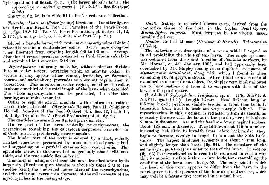 Jameson, H. L. 1912. Studies on pearl-oysters and pearls. - I. The structure of the shell and pearls of the Ceylon pearl-oyster (Margaritifera vulgaris Schumacher): With an examination of the cestode theory of pearl production. Proceedings of the Zoological Society of London 2: 260-358. (245) Download PDFSchmidt, G. D. 1986. Handbook of tapeworm identification. CRC Press, Boca Raton, Florida, 675 pp. (660) Download PDF |
