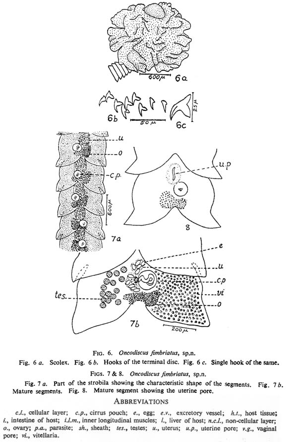 Fig. 6 - a) Scolex; b) Hooks of the terminal disc; c) Single hook of the same. Fig 7 - a) Part of the strobila showing the characteristic shape of the segment; b) mature segments. Fig. 8 - Mature segment showing the uterine pore.