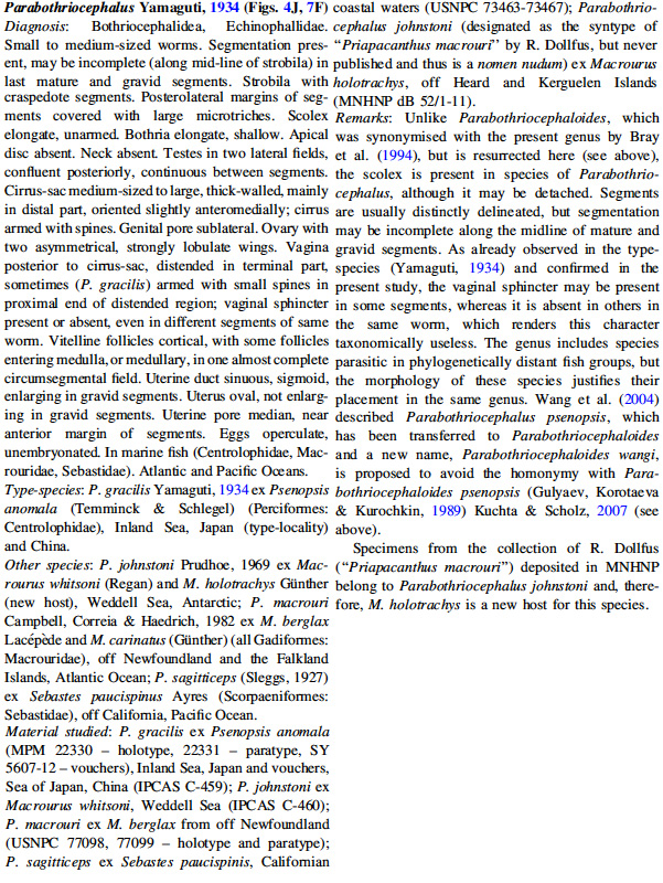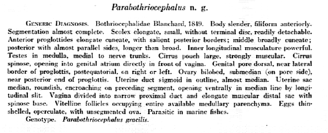 | Type Species | Parabothriocephalus gracilis Yamaguti, 1934 |