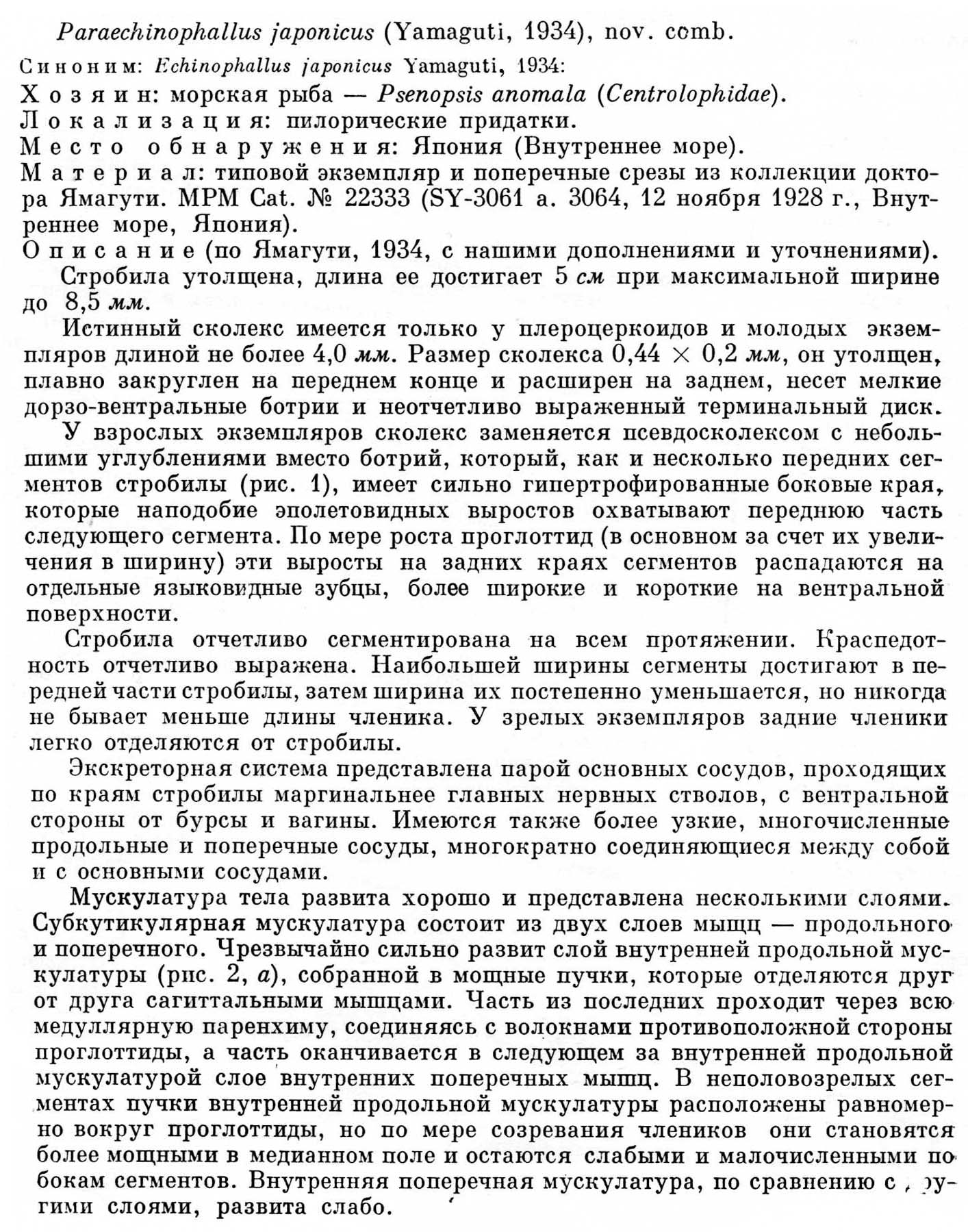 Yamaguti, S. 1934. Studies on the helminth fauna of Japan. Part 4. Cestodes of fishes. Japanese Journal of Zoology 6: 1-112. (510) Download PDFProtasova, E. N. 1975. Paraechiophallus nov. gen. (Pseudophyllidea) or marine fish Pseopsis anomala.. Trudy Gel'mintologicheskoi laboratorii 25: 109-115. (6388) Download PDF |