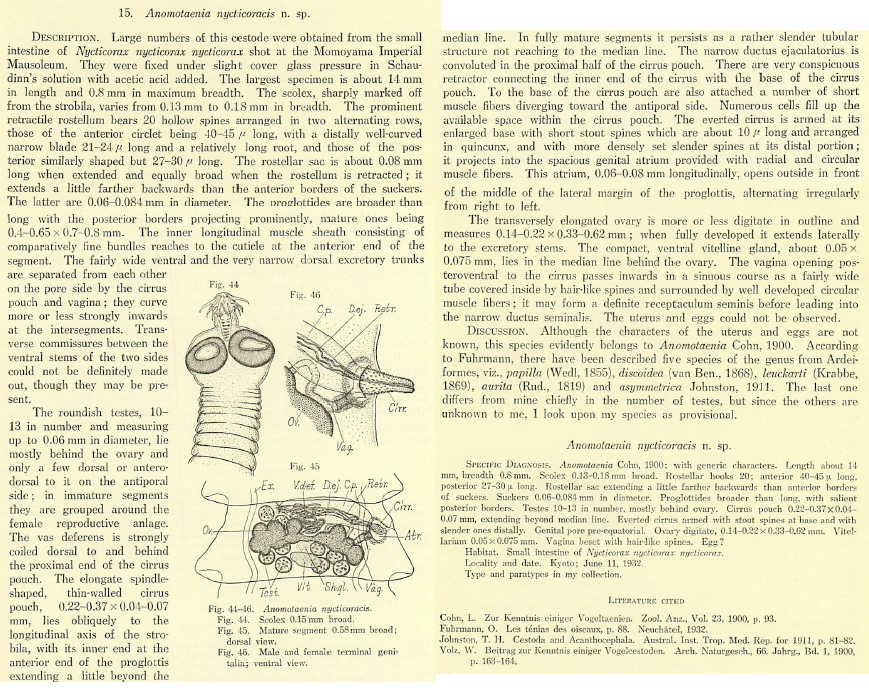 Yamaguti, S. 1935. Studies on the Helminth Fauna of Japan. Part 6. Cestodes of birds, I. Japanese Journal of Zoology 6 (2): 183-232. (3091) Download PDFYamaguti, S. 1959. Systema Helminthum. Vol. II. The Cestodes of Vertebrates. Keigaku Publishing House, Tokyo, 860 pp. (694) Download PDF |