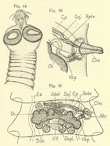 Fig. 44-46. Anomotaenia nycticoracis. Fig. 44. Scolex 0.15mm broad. Fig. 45. Mature segment 0.58mm broad; dorsal view. Fig. 46. Male and female terminal genitalia; ventral view.