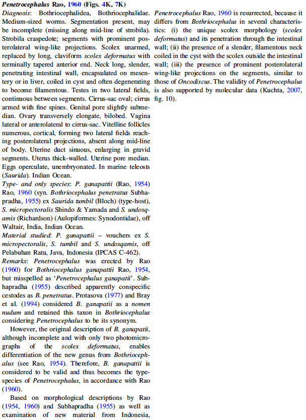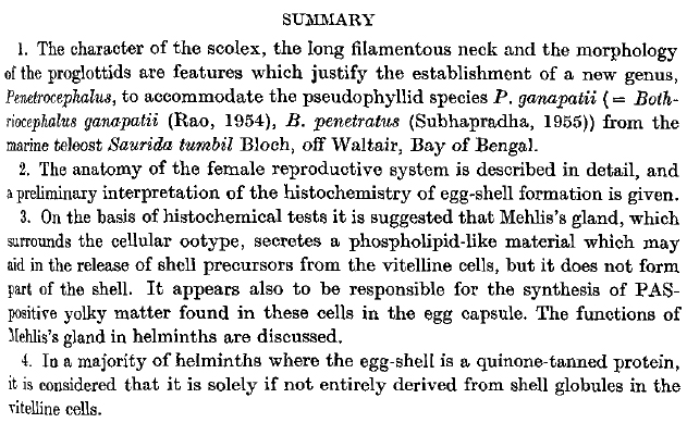 Rao, H. K. 1960. Studies on Penetrocephalus ganapatii, a new genus (Cestoda: Pseudophyllidea) from the marine teleost Saurida tumbil (Bloch). Parasitology 50: 155-163. (6377) Download PDF |