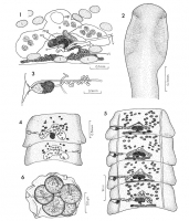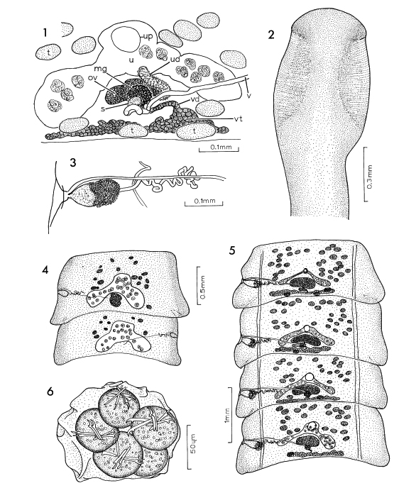 FIGURES 1-6. Philobythos atlanticus. 1. Detail of female reproductive system. 2. Scolex, holotype. 3. Detail of terminal genitalia. 4. Gravid segments. 5. Transition zone in strobila from mature to gravid segments; note unilateral genital pores, distribution of testes, and development of uterus. 6. Capsule containing five hexacanth embryos.