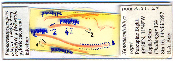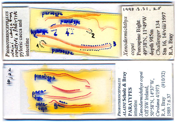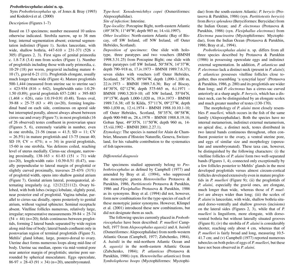 Scholz, T. and R. A. Bray. 2001. Probothriocephalus alaini n. sp. (Cestoda: Triaenophoridae) from the deep-sea fish Xenodermichthys copei in the North Atlantic Ocean. Systematic Parasitology 50: 231–235. (4978) Download PDF |