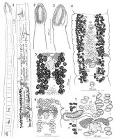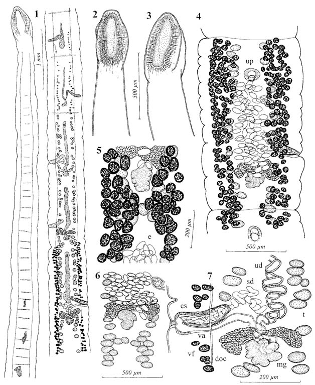 Figure 1–7. Probothriocephalus alaini n. sp. from Xenodermichthys copei. 1. Entire anterior region (including first gravid proglottid) of