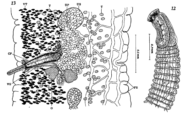 Plate III. Fig. 12. Scolex of Amphicotyle quinquarii, ventrolateral view. Fig. 13. Gravid proglottis of Amphicotyle quinquarii, ventral view.