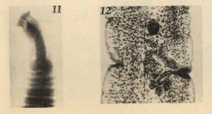 Plate XIX. Fig. 11. Scolex of Amphicotyle quinquarii, 25x. Fig. 12. Gravid proglottis of Amphicotyle quinquarii, 25x.