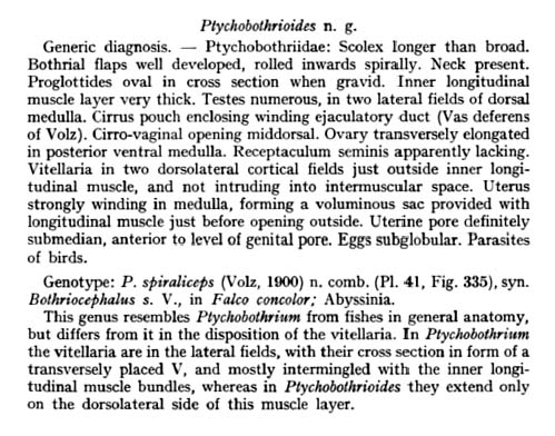 | Type Species | Ptychobothrioides spiraliceps (Volz, 199) Yamaguti, 1959 |
