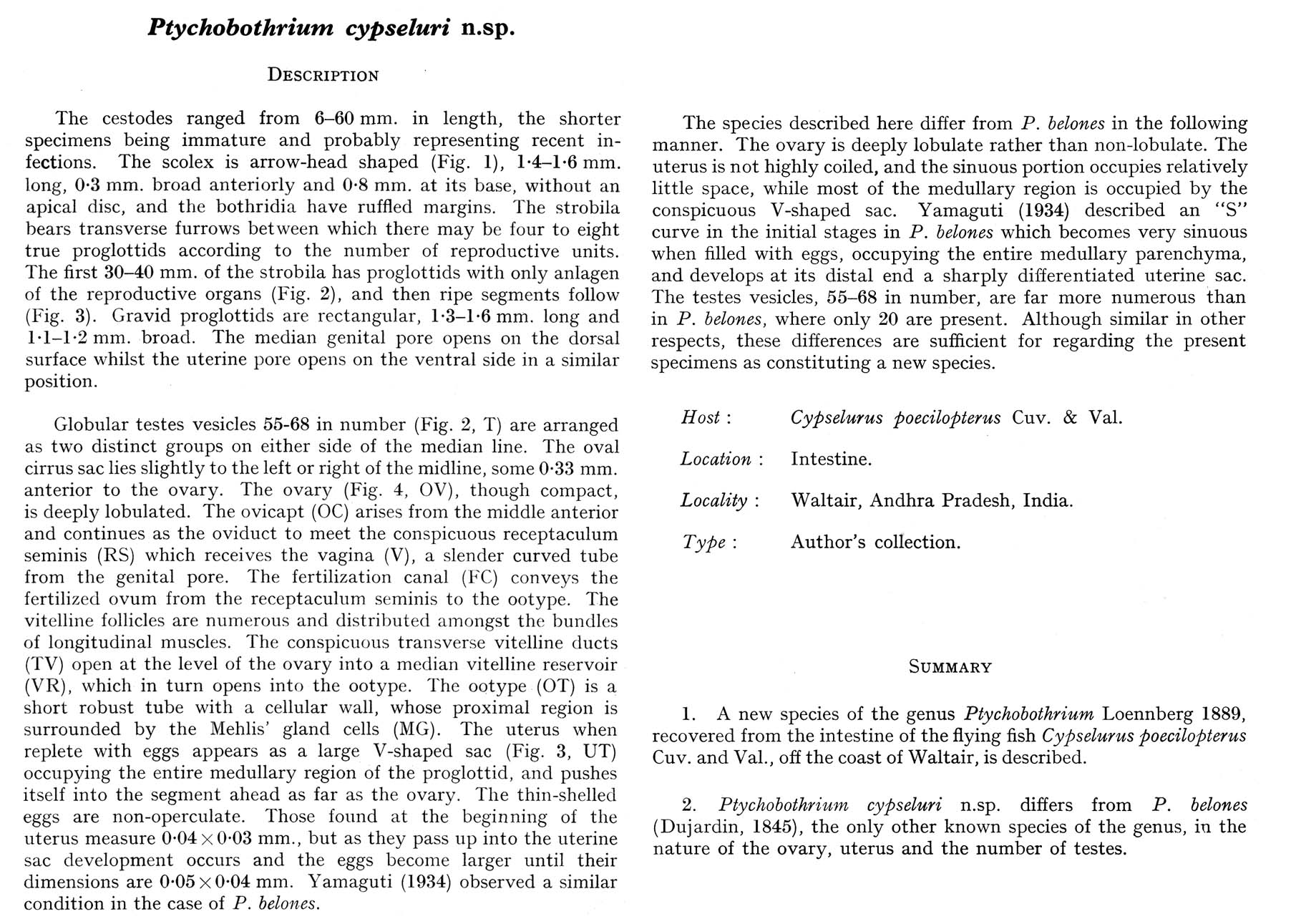 Rao, H K. 1959. On Ptychobothrium cypseluri n. sp. (cestoda: Pseudopyllidea) from the flying fish, Cypselurus poecilopterus caught off Waltair. Journal of Helminthology 33: 267-272. (6381) Download PDF |