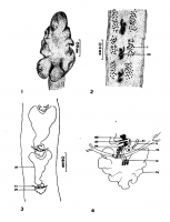 Fig. 1. - Scolex. Fig. 2. - Anterior proglottids showing testes vesicles (T), and rudiments of the reproductive system (RD). Fig. 3. - Ripe proglottids with V-shaped uterine sac (UT). OV = Ovary; TV = Transverse vitelline duct. Fig. 4. - Diagram showing the ovary and the reproductive ducts.. FC = Fertilization canal ; MG = Mehlis' gland ; OC = Oocapt ; OT = Ootype ; OV = Ovary ; RS = Receptaculum seminis ; V = Vagina ; VR = Vitelline reservoir.