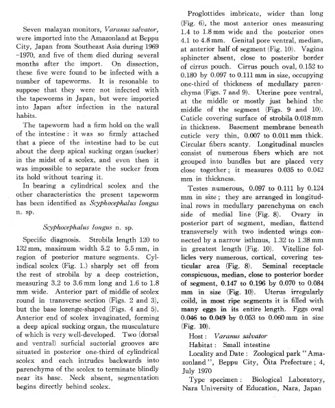 Sawada, I. and G. Kugi. 1973. A new species of Scyphocephalus (Cestoda) from Malayan monitor Varanus salvator. Japanese Journal of Parasitology 22(3): 126-130.