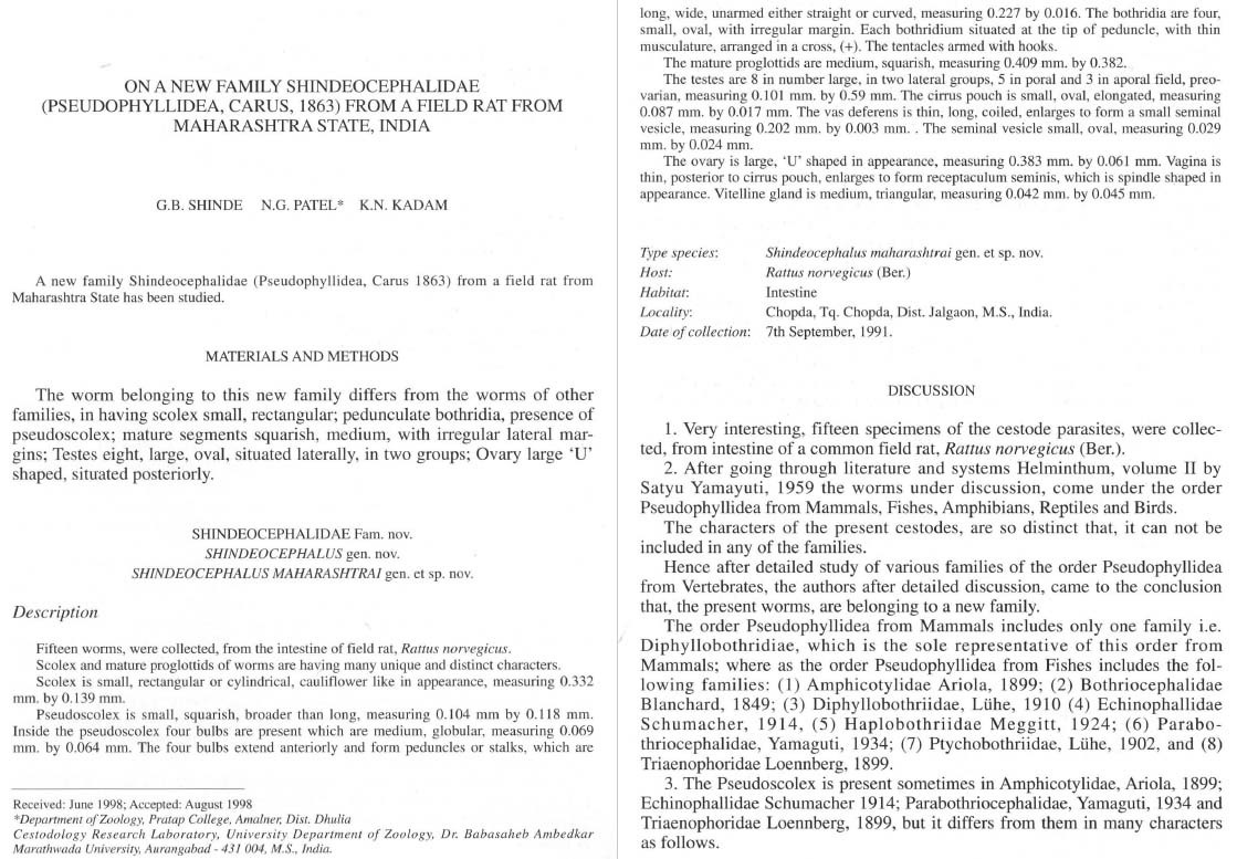 Shinde, G. B., N. G. Patel, and K. N. Kadam. 1998. On a new family Shindeocephalidae (Pseudophyllidea, Carus, 1863) from a field rat from Maharastra State, India. Rivista di Parassitologia 15: 309-313. (7352) Download PDF |