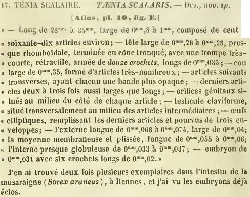Dujardin, F. 1845. Histoire Naturelle des Helminthes ou Vers Intestinaux. Librairie Encyclopédique de Roret, Paris, 654 pp & 12 Plat pp. (2594) Download PDF |