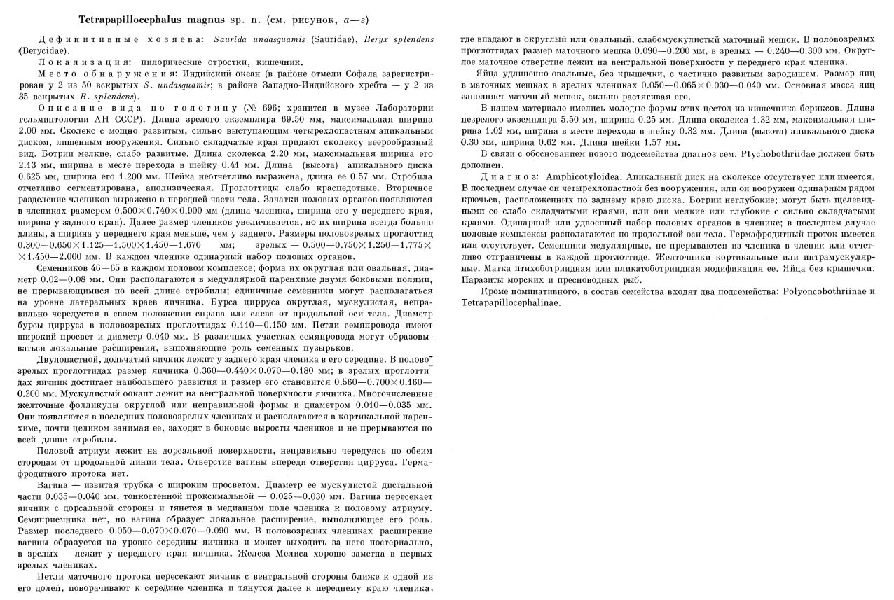 Protasova, E. N. and T. N. Mordvinova. 1986. A ptychobothriid cestode, Tetrapapillocephalus magnus n. g., n. sp. (Pseudophyllidea, Ptychobothriidae) from marine fish. Parazitologiya 20: 313–316. (7351) Download PDF |