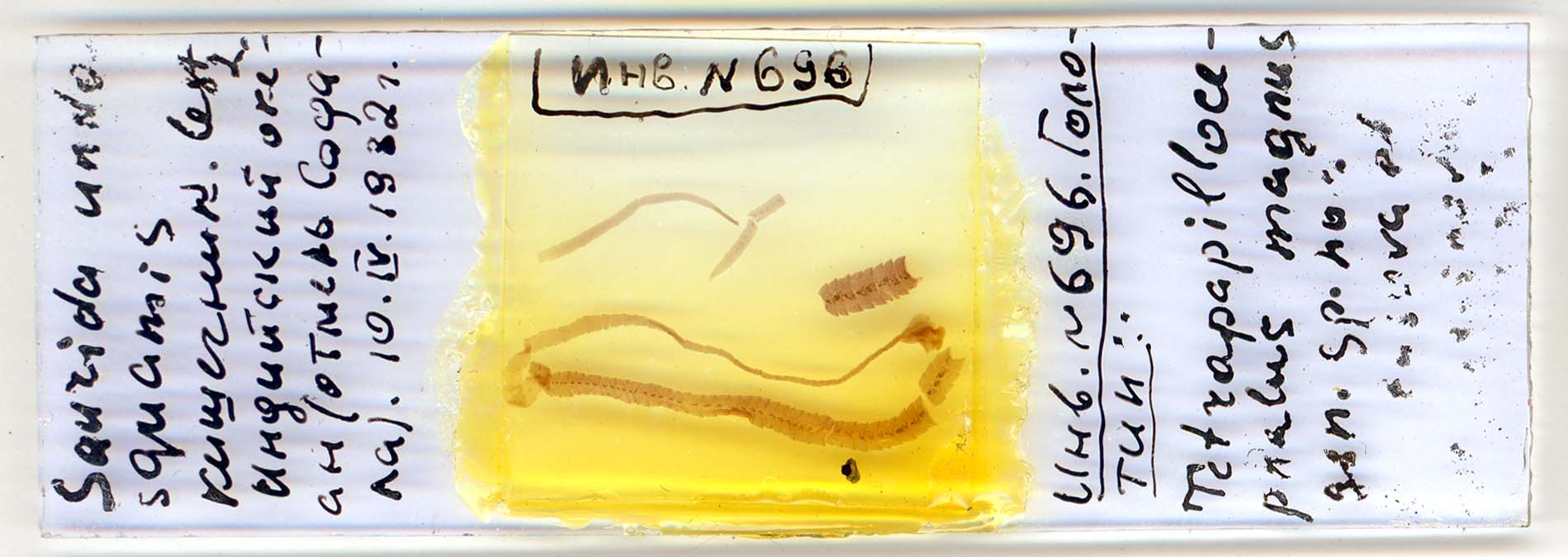 | Specimen Notes | -plerocercoid on the slide with the holotype of Partitiotestis berycis Protasova & Parukhin, 1986 (GELAN 986). |
