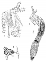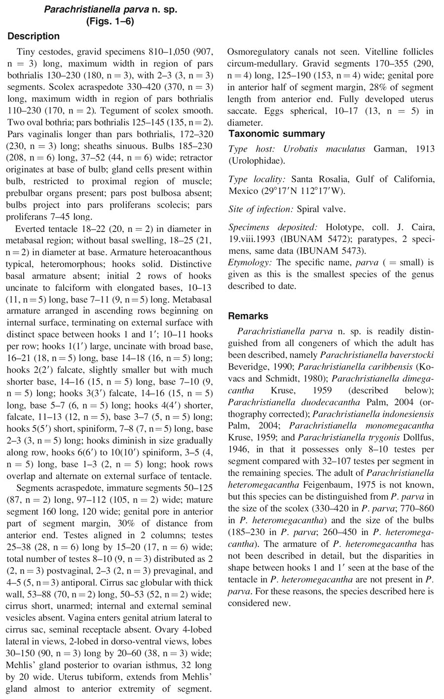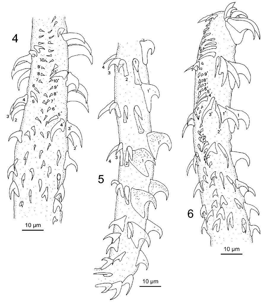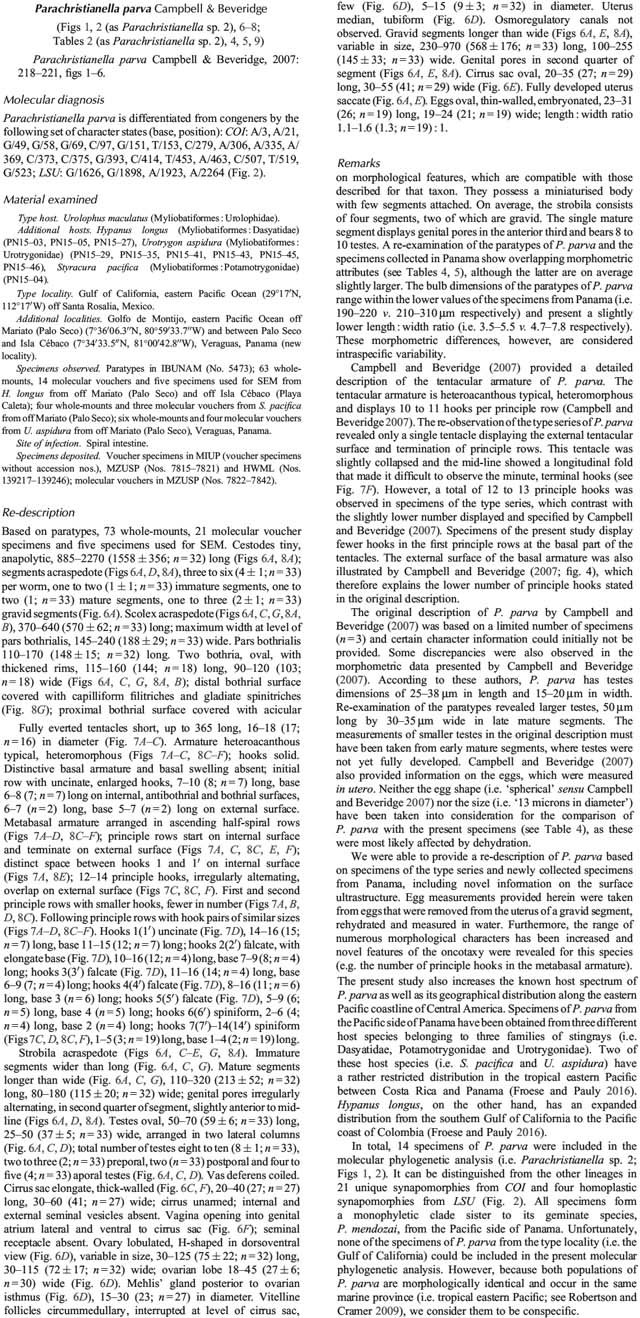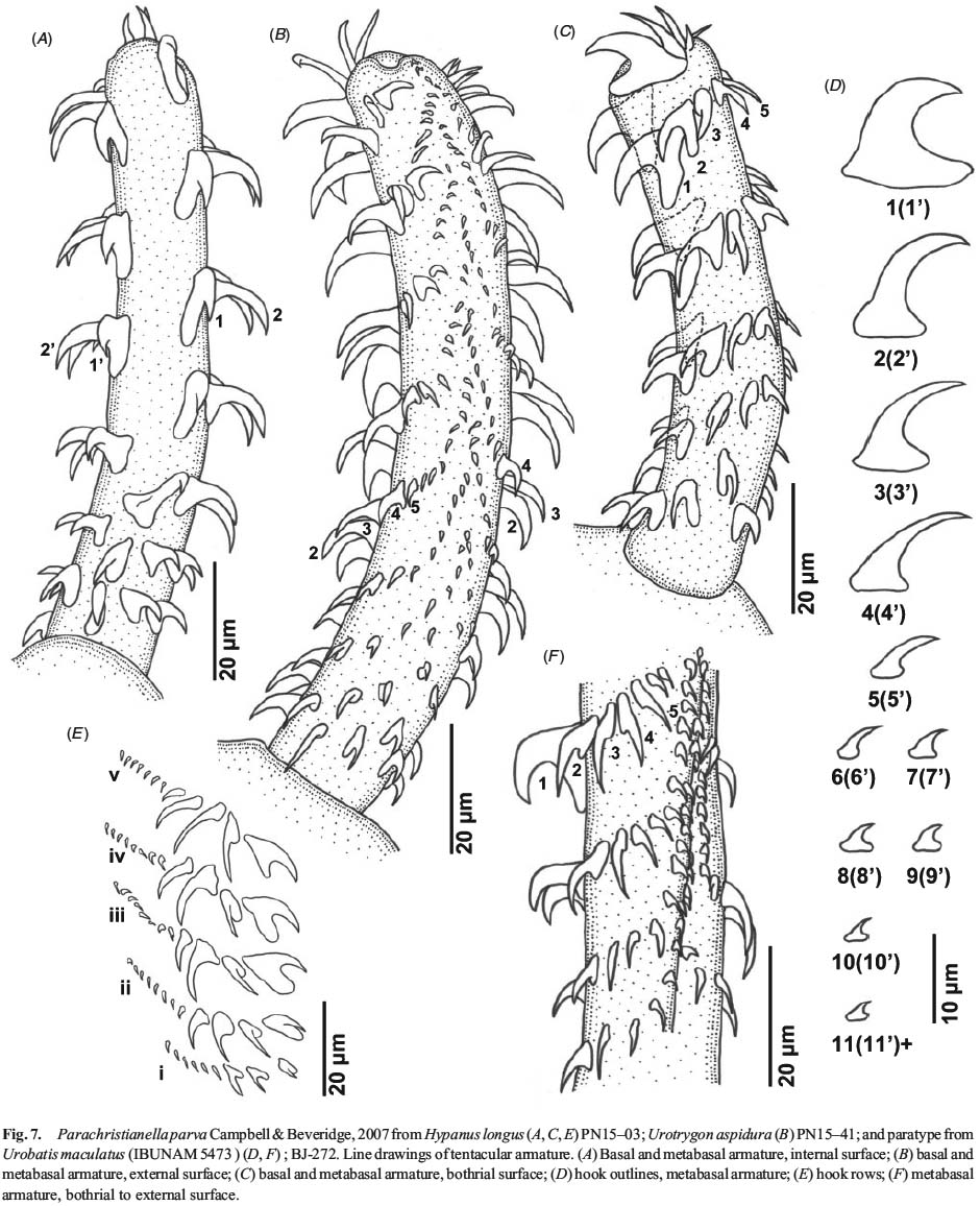 Fig. 7. Parachristianella parva Campbell&Beveridge, 2007 from Hypanus longus (A,C,E)PN15–03; Urotrygon aspidura (B)PN15–41; and paratype from Urobatis maculatus (IBUNAM 5473 ) (D, F) ; BJ-272. Line dr... MoreFig. 7. Parachristianella parva Campbell&Beveridge, 2007 from Hypanus longus (A,C,E)PN15–03; Urotrygon aspidura (B)PN15–41; and paratype from Urobatis maculatus (IBUNAM 5473 ) (D, F) ; BJ-272. Line drawings of tentacular armature. (A) Basal and metabasal armature, internal surface; (B) basal and