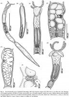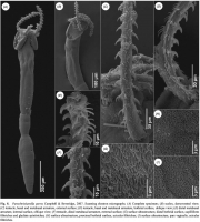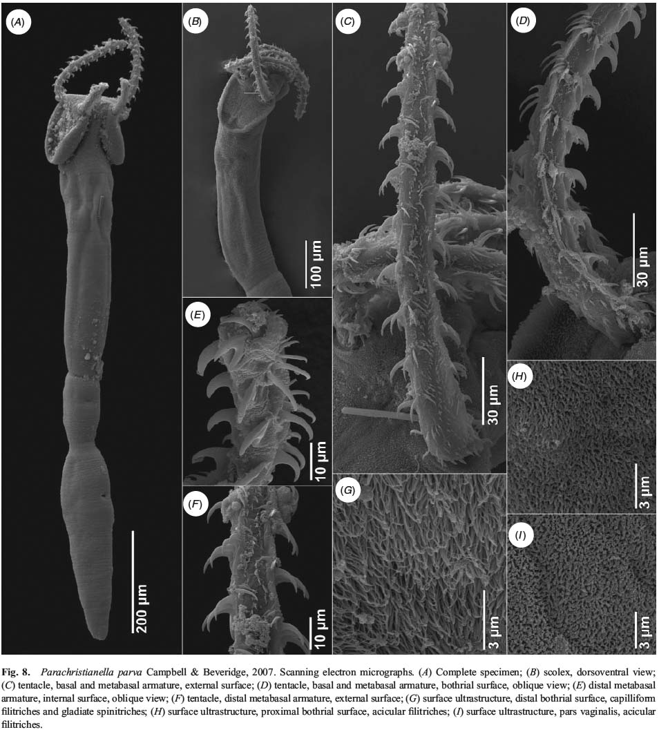 Fig. 8. Parachristianella parva Campbell & Beveridge, 2007. Scanning electron micrographs. (A) Complete specimen; (B) scolex, dorsoventral view; (C) tentacle, basal and metabasal armature, external su... MoreFig. 8. Parachristianella parva Campbell & Beveridge, 2007. Scanning electron micrographs. (A) Complete specimen; (B) scolex, dorsoventral view; (C) tentacle, basal and metabasal armature, external surface; (D) tentacle, basal and metabasal armature, bothrial surface, oblique view; (E) distal metabasal armature, internal surface, oblique view; (F) tentacle, distal metabasal armature, external surface; (G) surface ultrastructure, distal bothrial surface, capilliform filitriches and gladiate spinitriches; (H) surface ultrastructure, proximal bothrial surface, acicular filitriches; (I) surface ultrastructure, pars vaginalis, acicular filitriches. |