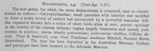 Type Species Balanotaenia bancrofti Johnston, 1924
