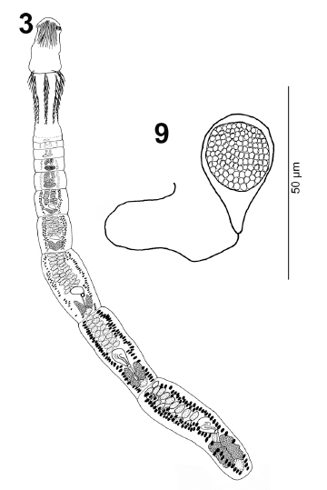 | Total Number of Type Specimens | based on whole mounts of 12 mature worms, 5 compressed scoleces, semi-permanent mount of 1 gravid proglottid in lactophenol and 2 specimens examined with SEM |