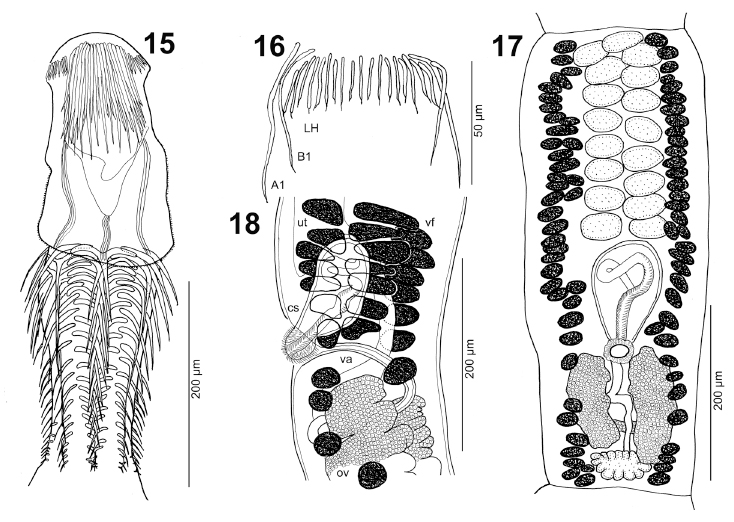 terminal genitalia, lateral view. Figs. 13, 17. Mature proglottid. Abbreviations: A1 – first A hook; B1 – first B hook; cs – cirrus-sac;