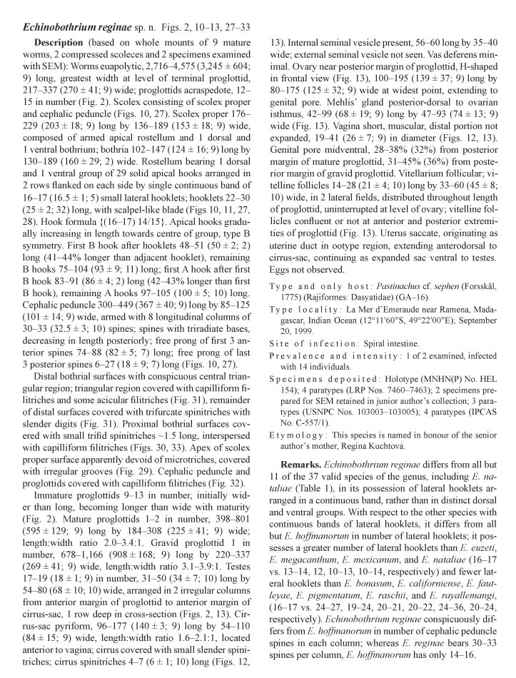 Kuchta, R. and J. N. Caira. 2010. Three new species of Echinobothrium (Cestoda: Diphyllidea) from Indo-Pacific stingrays of the genus Pastinachus (Rajiformes: Dasyatidae). Folia Parasitologica 57(3): 185196. (4728) Download PDF |