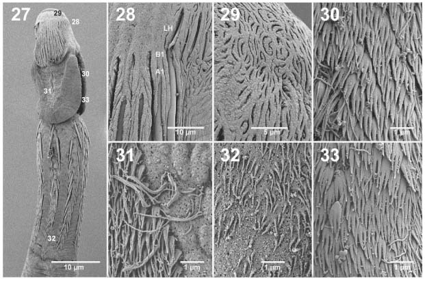 to the figures showing higher magnification images of these surfaces. Fig. 28. Detail of first apical hooks and lateral hooklets.