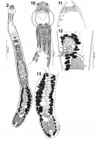 Fig. 2. Echinobothrium reginae sp. n., whole worm. Figs. 1013. Echinobothrium reginae sp. n. Fig. 10. Scolex. Fig. 11. Hooklets. Fig. 12. Detail of terminal genitalia, lateral view. Fig. 13. Mature proglottid. Abbreviations: A1 first A hook; B1 first B hook; cs cirrus-sac;