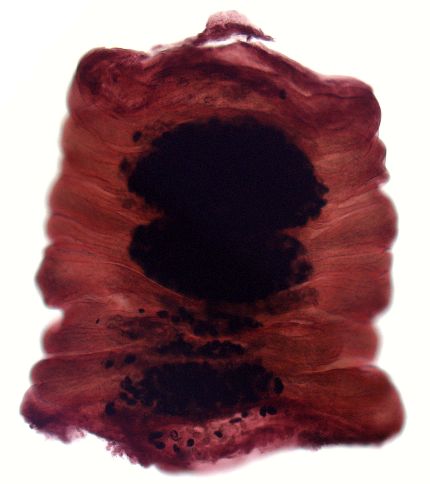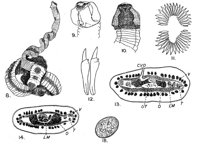 10. Scolex with contracted crown, the hooks appearing to form a continuous circle. ( X 535.)