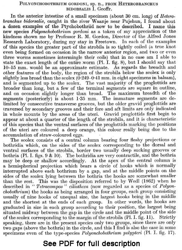 Woodland, W. N. F. 1937. Some cestodes from Sierra Leone. II. A new caryophyllaeid, Marsypocephalus and Polyonchobothrium. Proceedings of the Zoological Society of London 107: 189-192. (658) Download PDFKuchta, R. and T. Scholz. 2007. Diversity and distribution of fish tapeworms of the "Bothriocephalidea" (Eucestoda). Parassitologia 49: 21-38. (4609) Download PDF |