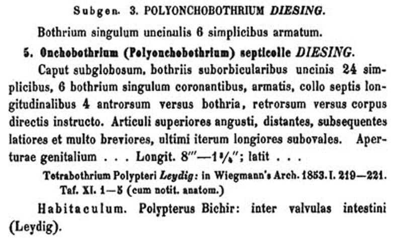 | Scientific Name Notes | desctibed as Onchobothrium (Polyonchobothrium) septicolle Diesing, 1854 |