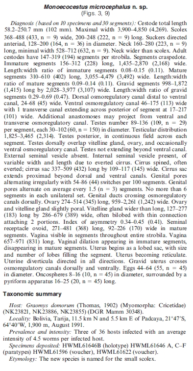 Haverkost, T. R. and Gardner, S. L. 2010. New species in the genus Monoecocestus (Cestoda: Anoplocephalidae) from Neotropical rodents (Caviidae and Sigmodontinae). Journal of Parasitology 96: 580-595.